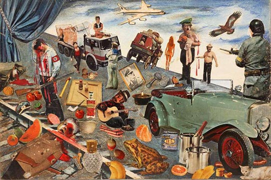 Barladeanu’s tragic tale with a happy ending began in the year of 1946 when he was born in the village of Zapodeni, Romania. He spent first thirty years of his life as a rebel who refused to become what society called an honorable citizen, never accepting to become a part of a socialist labor system. Ultimately, he was forced to work as a gravedigger, a security guard and a saw worker, desperately trying to make ends meet. Caught up in all the anger and desperation of the world he never belonged to, it was only after 1989 that Ion found his true calling when he discovered a hidden talent he had for collage making. Before he became known for his work, Ion presented his prototype collages only to a few trusted friends, never taking his work too seriously and accepting it more as a hobby. This was partially due to his general shy nature, but prior to the year of 1989, much of Ion’s topics were quite controversial and not really suitable for stranger’s eyes. Up until his remarkable discovery in 2007, he was living in the area where garbage was discarded behind an apartment building and doing small jobs for the people who lived there in order to get food. He kept his art hidden not because of his old fears but because he did not believe anyone would be interested in seeing them. Ironically, nowadays his works are presented in galleries spread across Paris and London[1], placed alongside paintings of Andy Warhol and Marcel Duchamp –this becomes even more incredible when you remember his collages were kept under a garbage bin for most of their existence. Dan Popescu, the curator of Prague’s Czech Centre where his works can be seen, explained the hardships of his star: He had only obstacles to doing his art; society was against him, his father, a communist, was against what he was doing, he had no training … but he still found a way to make his art function for him. Furthermore, Popescu added: It’s hard to find an artist who uses art for inner purposes. For him his art was always a way to survive. He poured everything inside his art.